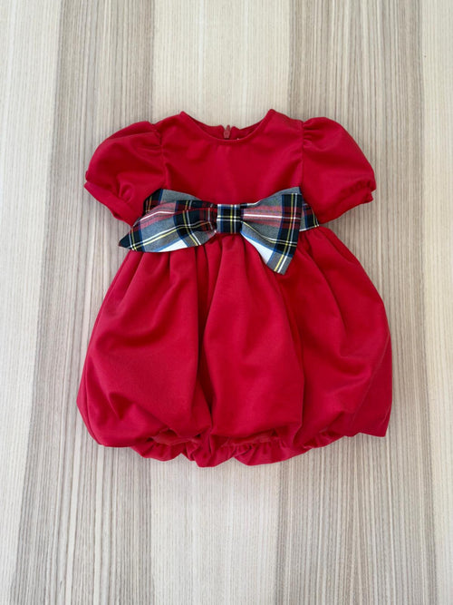 Abito a palloncino in velluto rosso e cinta in tartan